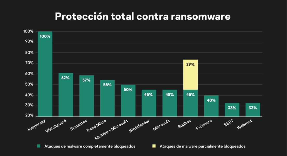 Kaspersky demostró un 100 % de eficiencia contra ataques de ransomware, según una evaluación reciente de AV-TEST. Como consecuencia de tres escenarios diferentes y 113 ejemplos de ataques, el producto no perdió ni un solo usuario y superó a 10 proveedores de ciberseguridad diferentes.